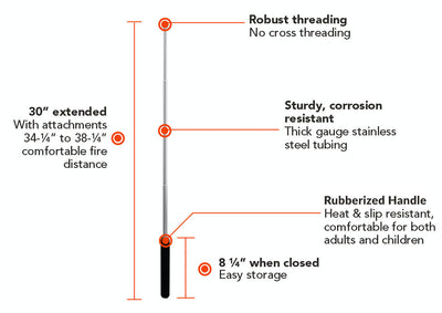 Extends from 34.25" to 38.25" with attachments, for a comfortable fire distance. Heat & slip resistant, comfortable for both adults and children.